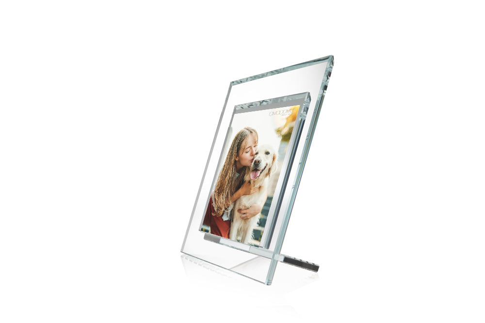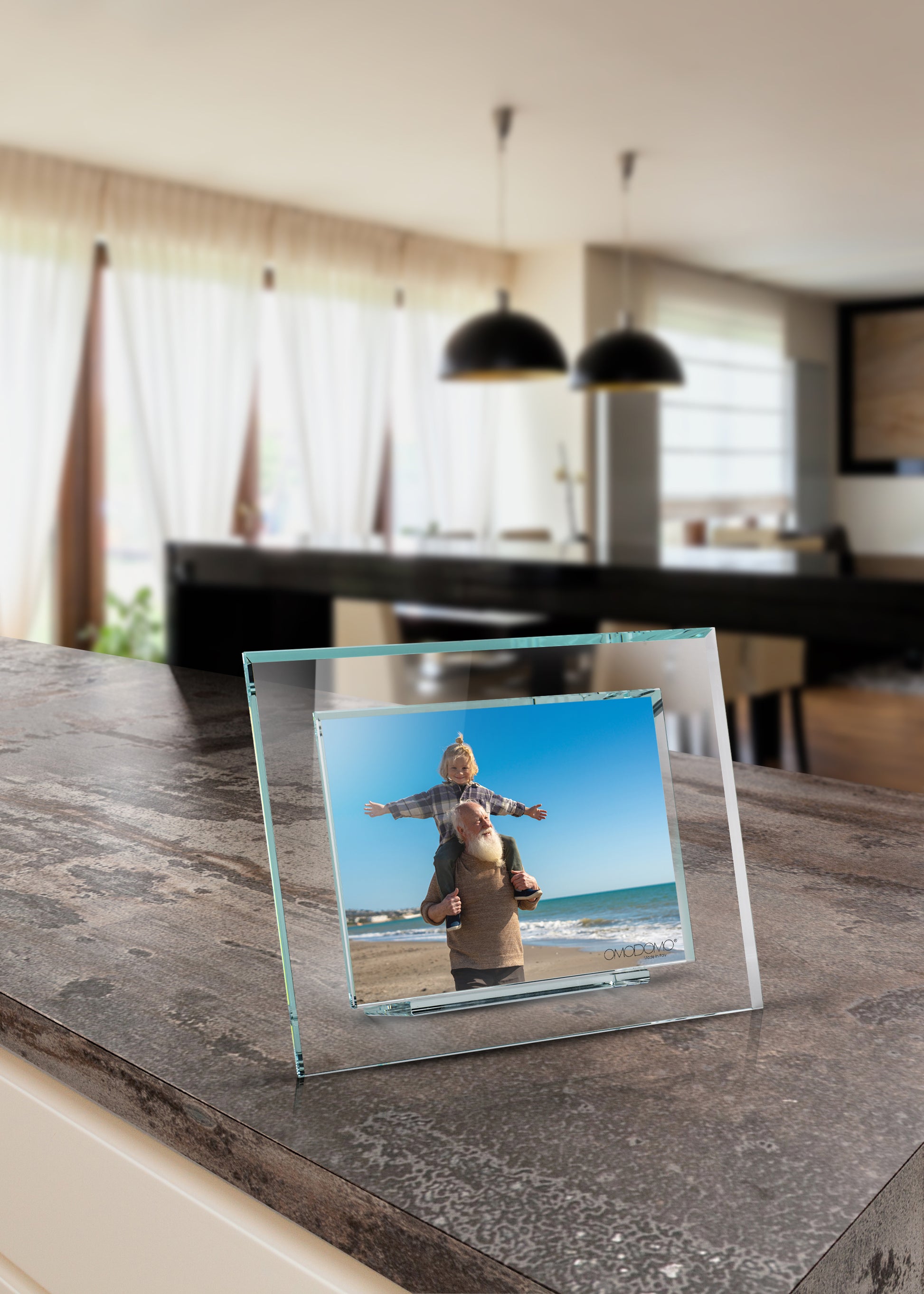 La trasparenza del cristallo permette alla fotografia di fondersi con lo spazio circostante, restituendo una sensazione di armonia e luce naturale.