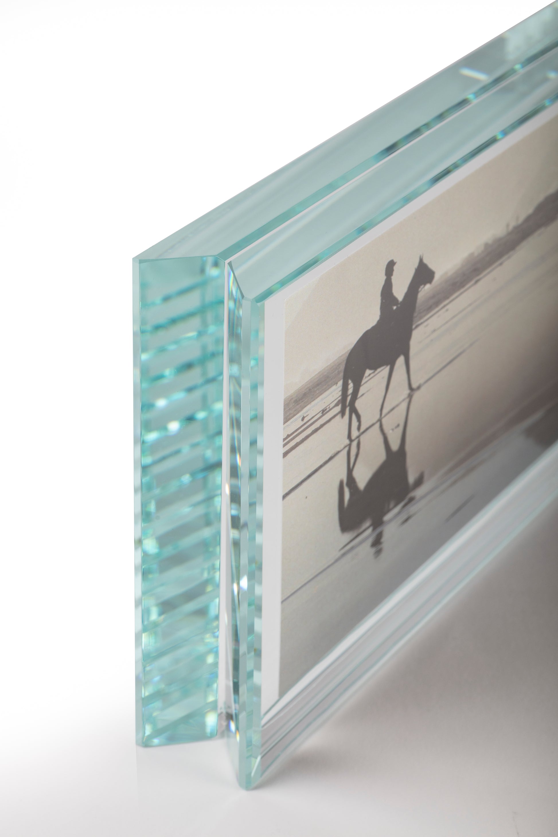 Day è un portaritratto composto da due lastre in cristallo extrachiaro da 15 mm, entrambe con bordo molato inclinato a 45°.