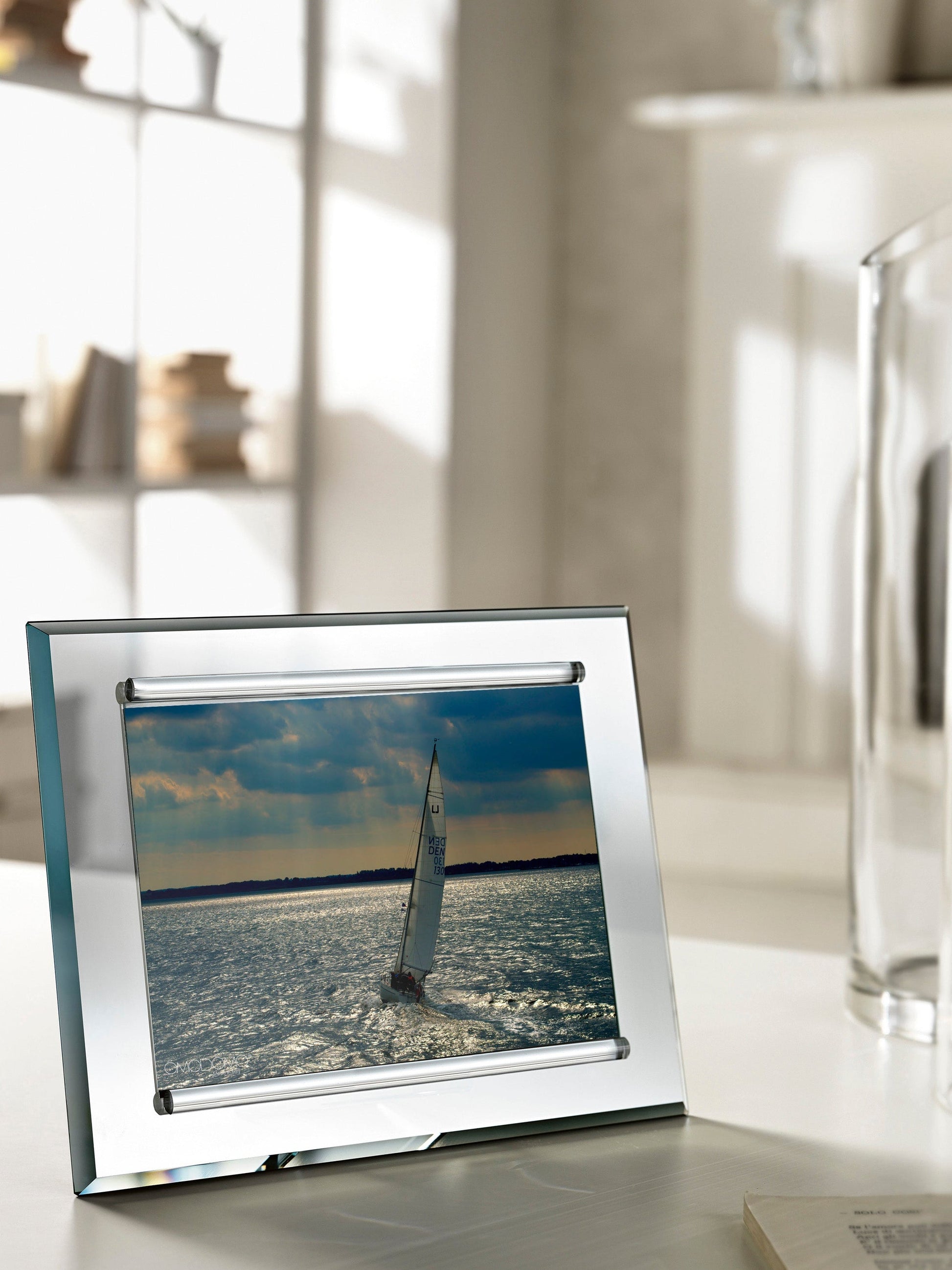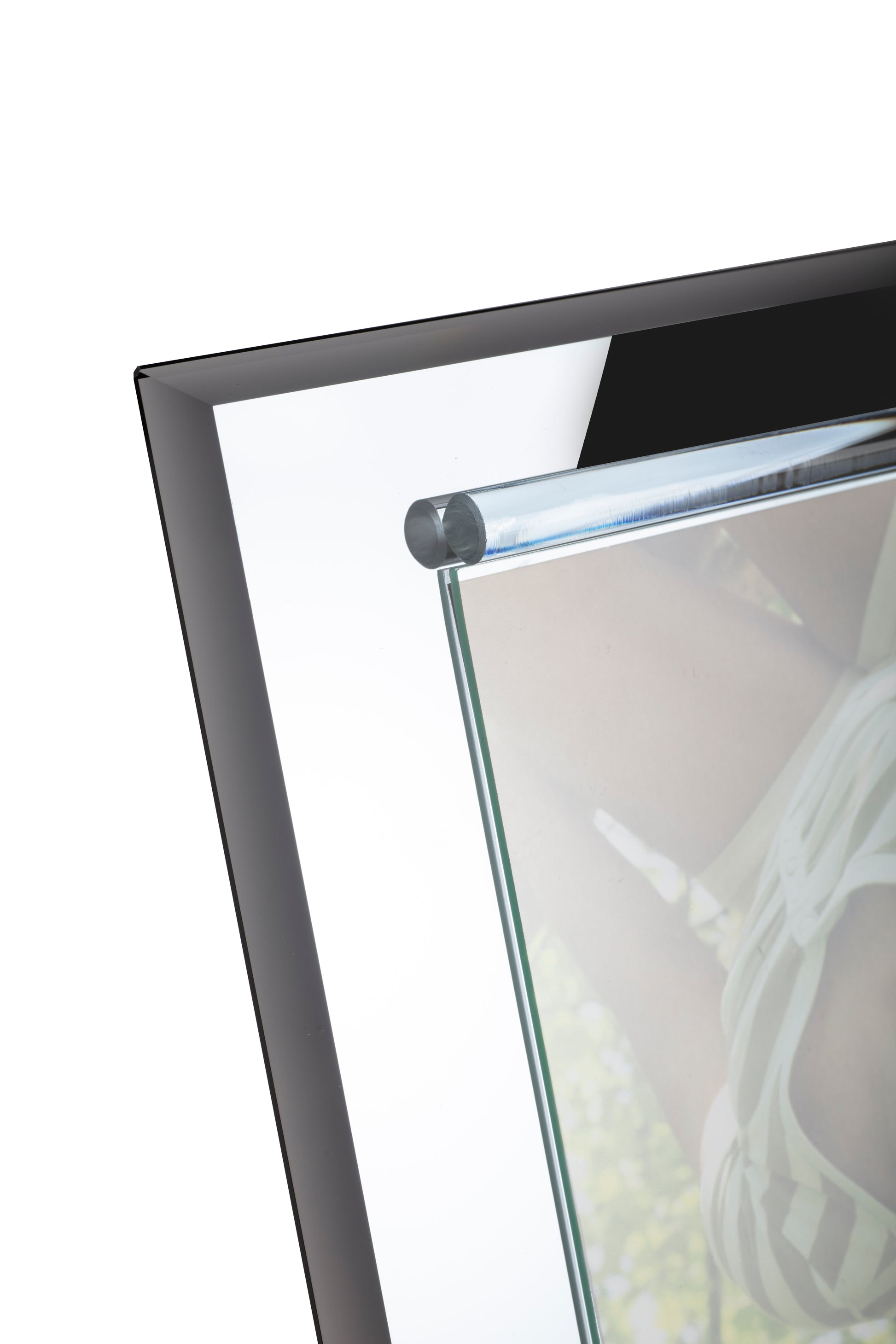 Grey è un portaritratto realizzato in cristallo specchiato grigio da 8 mm, con quattro lati molati e inclinati a 45° per riflettere la luce in modo armonioso ed elegante.