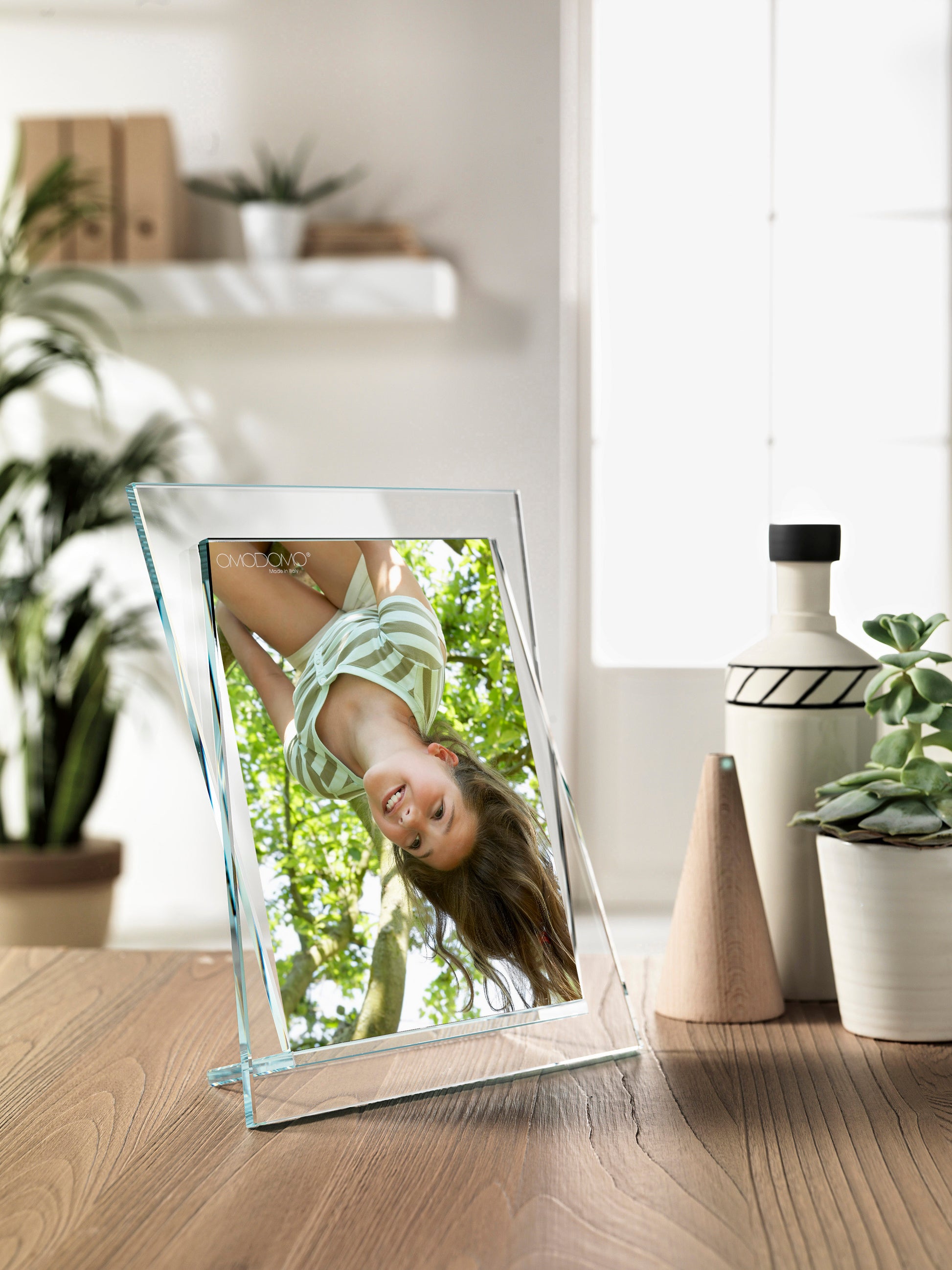 ICS è un portaritratto composto da due lastre trapezoidali sovrapposte in cristallo extrachiaro da 8 mm, lavorate con precisione artigianale per esaltare luce e prospettiva.