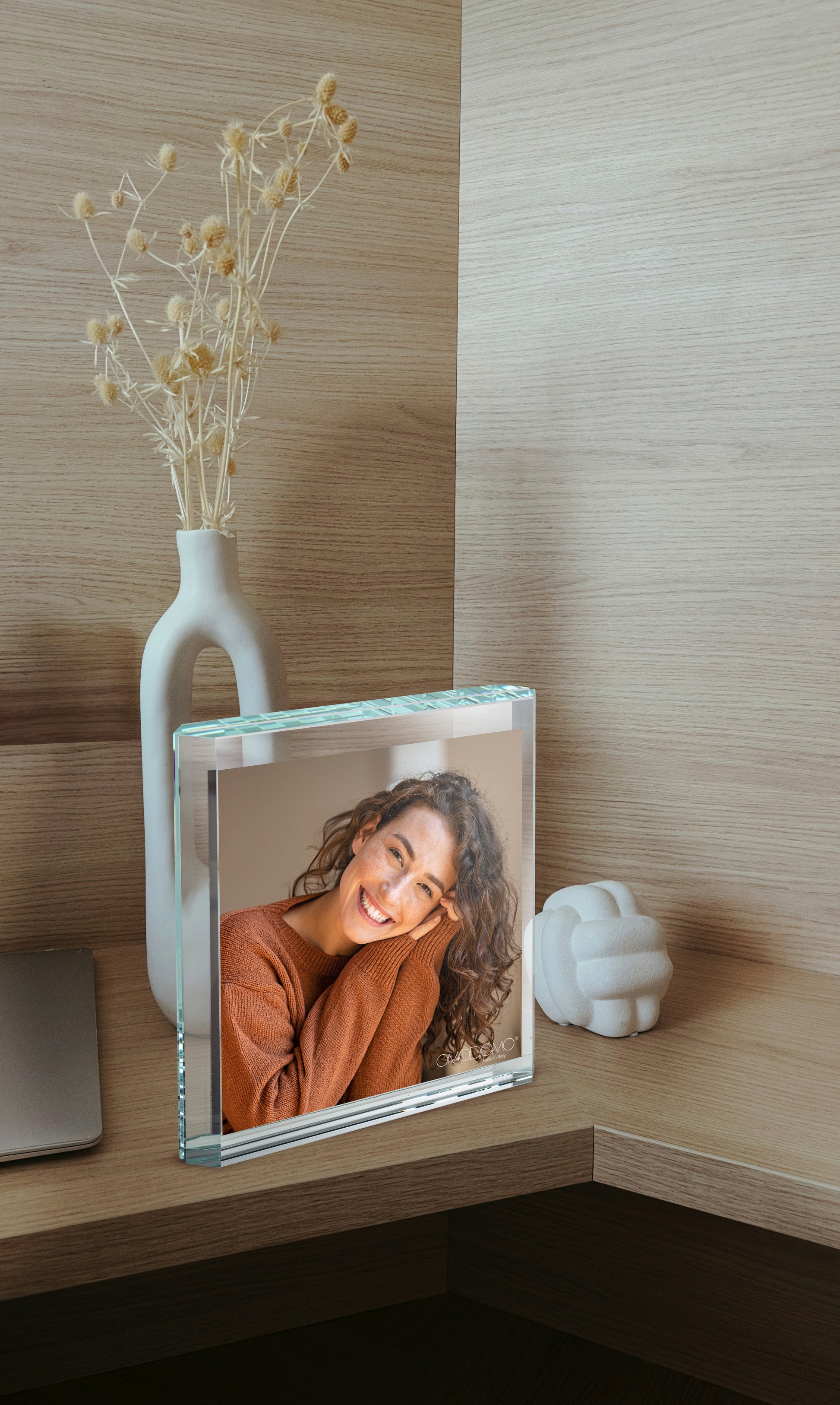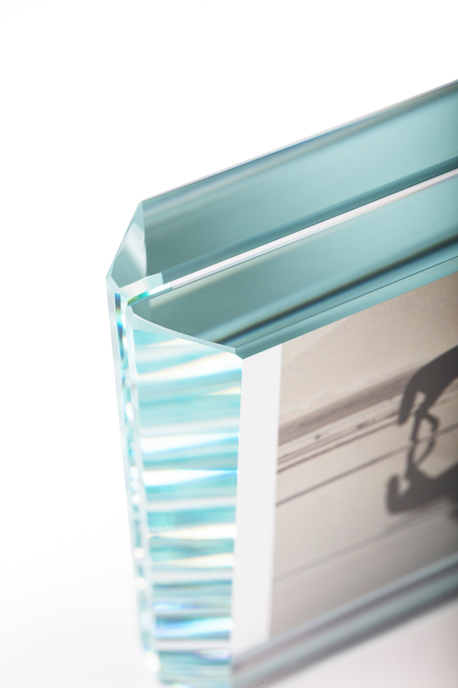 Night è un portaritratto composto da due lastre in cristallo extrachiaro da 15 mm, entrambe con bordo molato inclinato a 45° per riflettere la luce in modo morbido e raffinato.