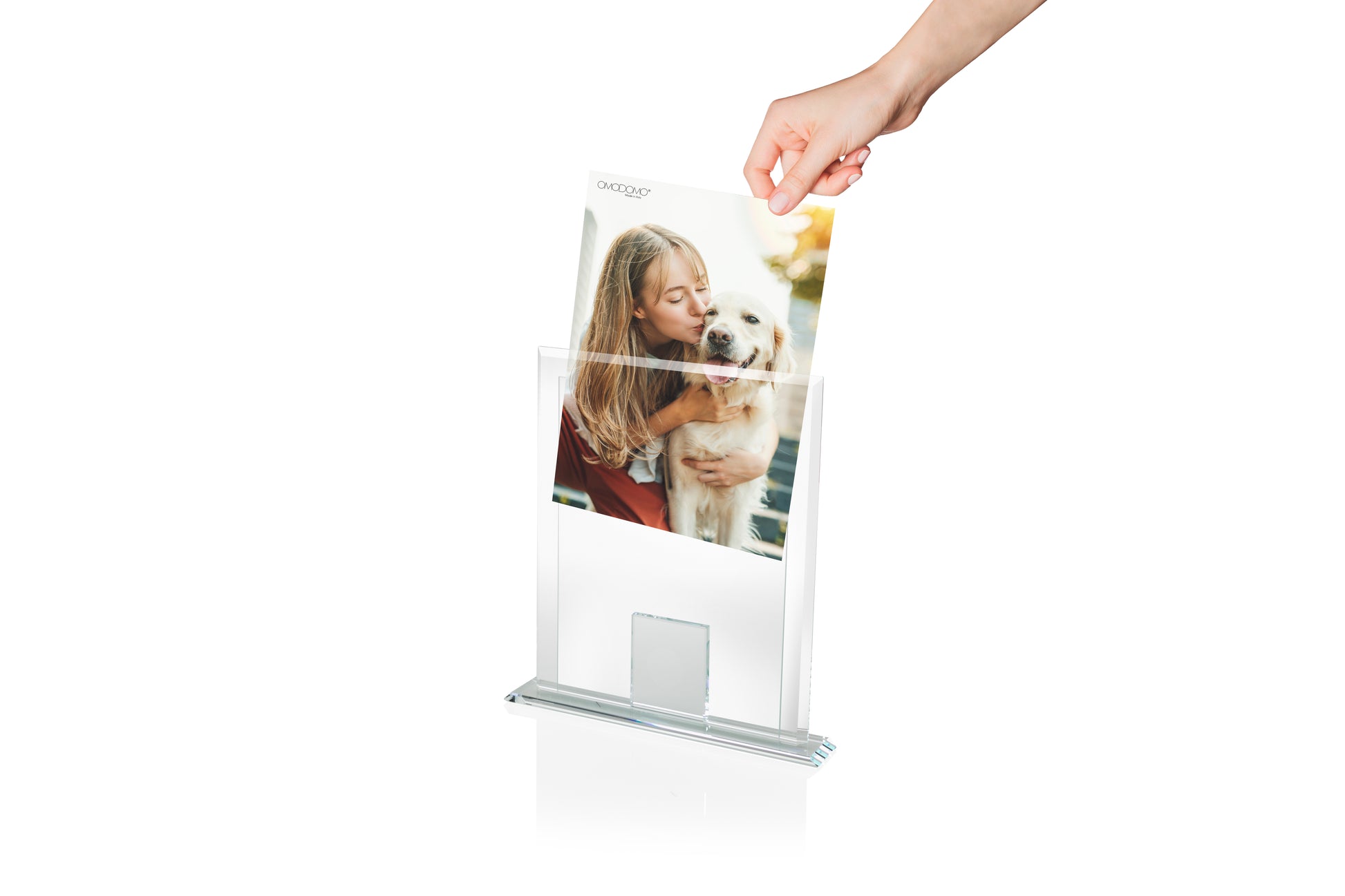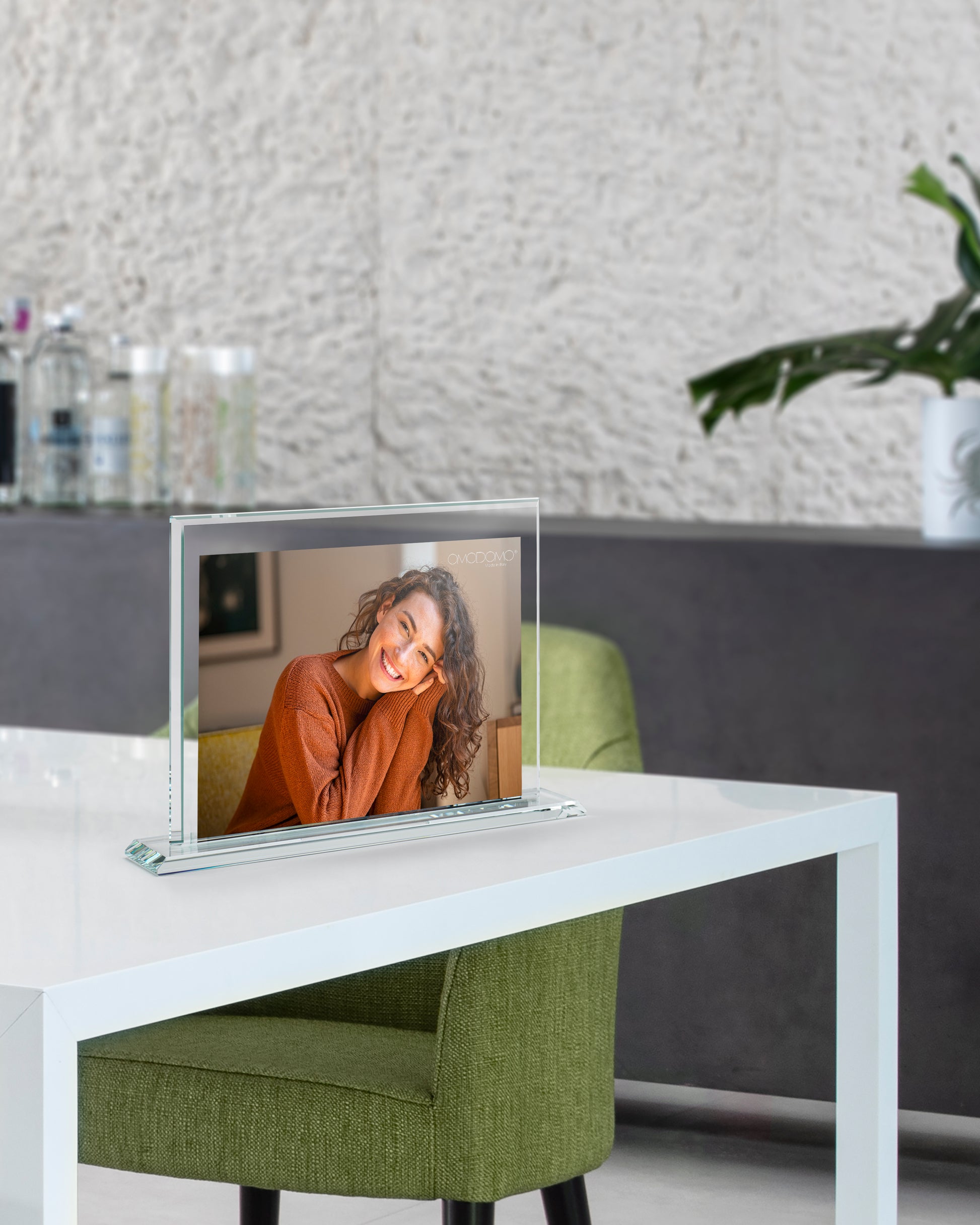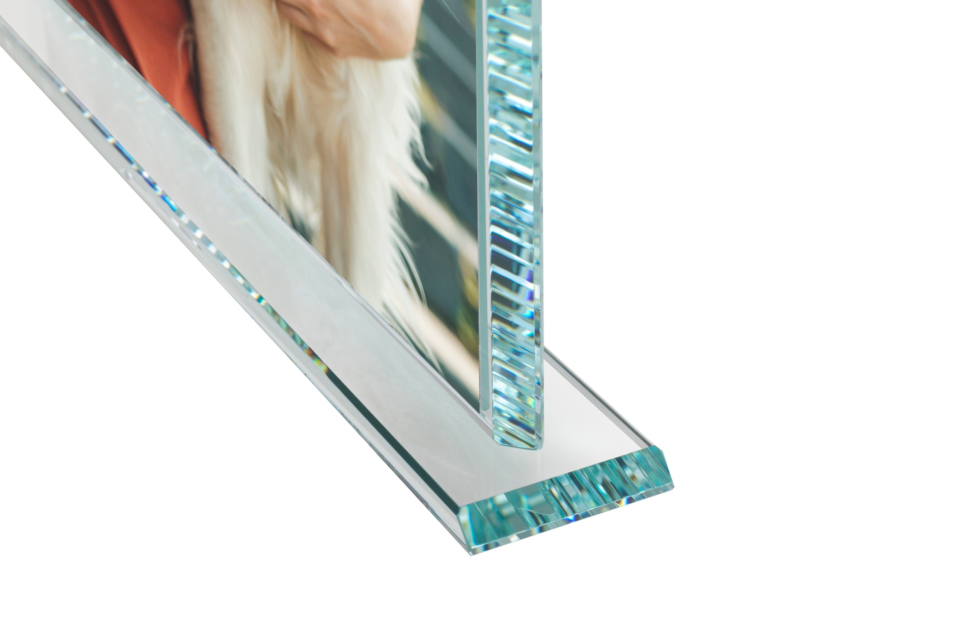 Le linee nette e la trasparenza pura esaltano la fotografia, donando all’immagine un’aura sospesa. L’effetto prismatico dei bordi molati crea un equilibrio tra forma e luce, trasformando la semplicità in eleganza visiva.